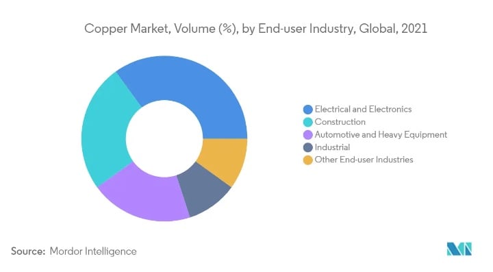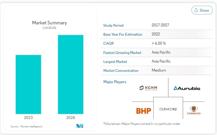 Laut der Beratungsfirma Mordor Intelligence wird das jährliche Wachstum der Kupferproduktion (CAGR) zwischen 2023 und 2028 bei etwa 6 % liegen, angetrieben durch die steigende Nachfrage in der Region Asien-Pazifik.