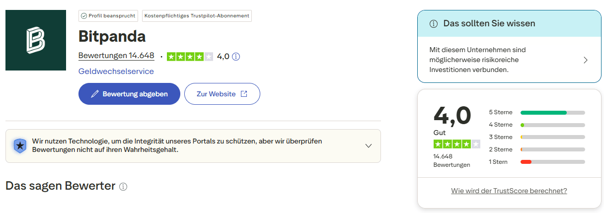 | Trustpilot | 4,0 / 5 („Great“) | 14.648 Rezensionen | Mehr „Service & Problemfälle“ (Support, Auszahlungen, Kontoprüfungen). Bitpanda antwortet laut Trustpilot auf 98% negativer Reviews und typischerweise binnen 1 Woche. |