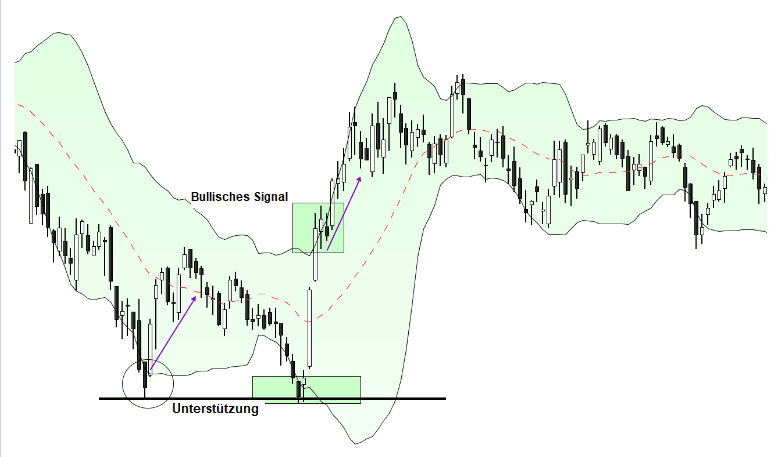 Wenn der Preis aus einem der Bänder austritt und dann zum Durchschnitt zurückkehrt (im Bereich der Bänder), wird das erzeugte Maximum oder Minimum zu einem Widerstand oder einer Unterstützung (erstes Diagramm).