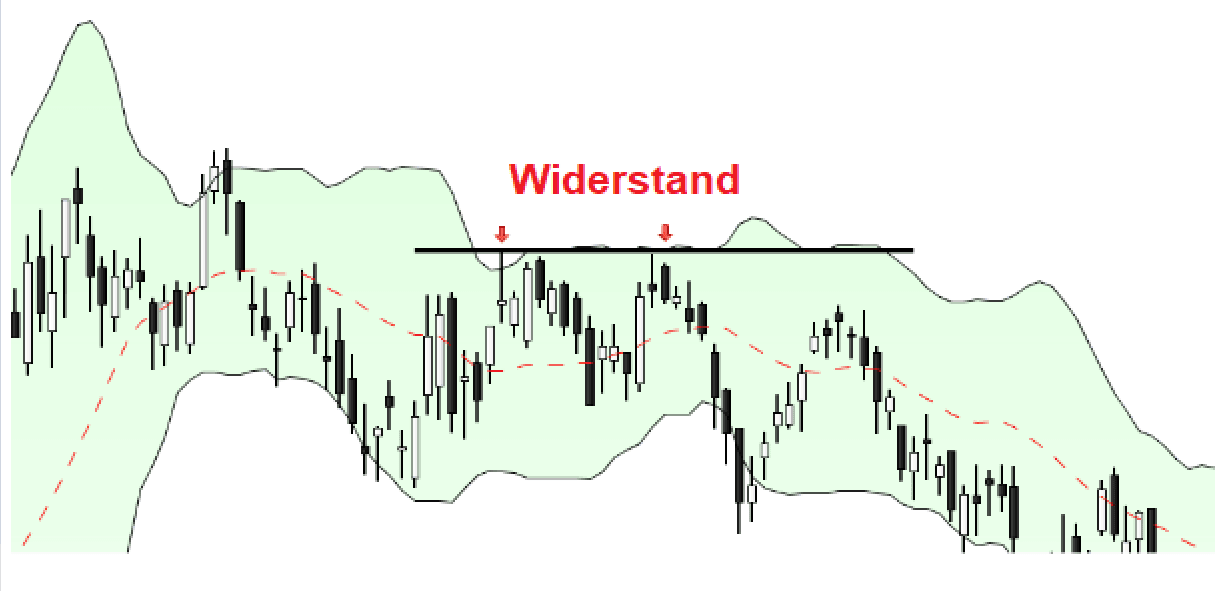 In diesem Beispiel sehen wir, wie in einem seitwärts gerichteten Trend das obere Bollinger-Band horizontal bleibt und einen Widerstand anzeigt.