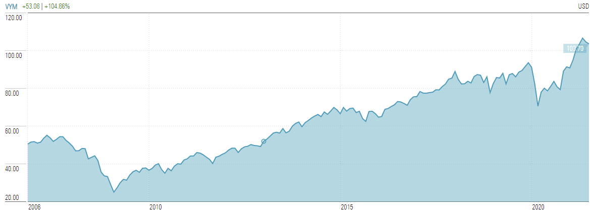 Der Vanguard High Dividend Yield ETF ähnelt dem oben besprochenen VIG-ETF-Fonds, aber anstatt sich auf die Beständigkeit der Dividendenausschüttung zu konzentrieren, investiert er ausschließlich in Unternehmen mit den höchsten Ausschüttungsrenditen. Sein Benchmark-Index ist der FTSE Global Equity Index Services.