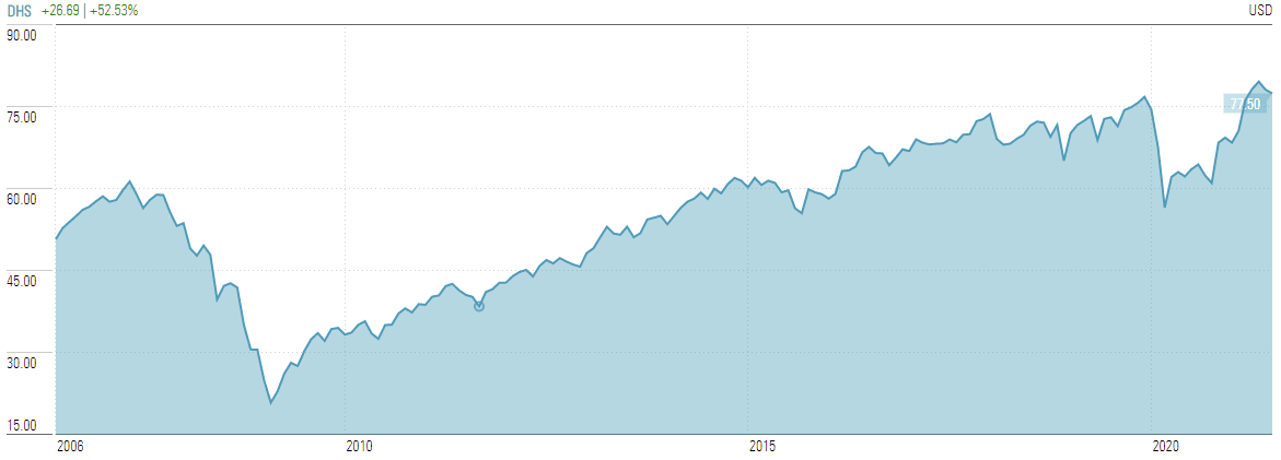 Die Top 10 Aktien, aus denen er besteht, sind: Philip Morris, Altria, Abbvie, Pfizer, Verizon, AT&T, Cisco, Coca Cola, IBM und Broadcom. Dies sind bewährte US-Unternehmen mit stabilen Dividendenhistorien.