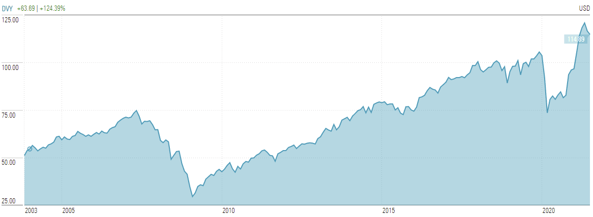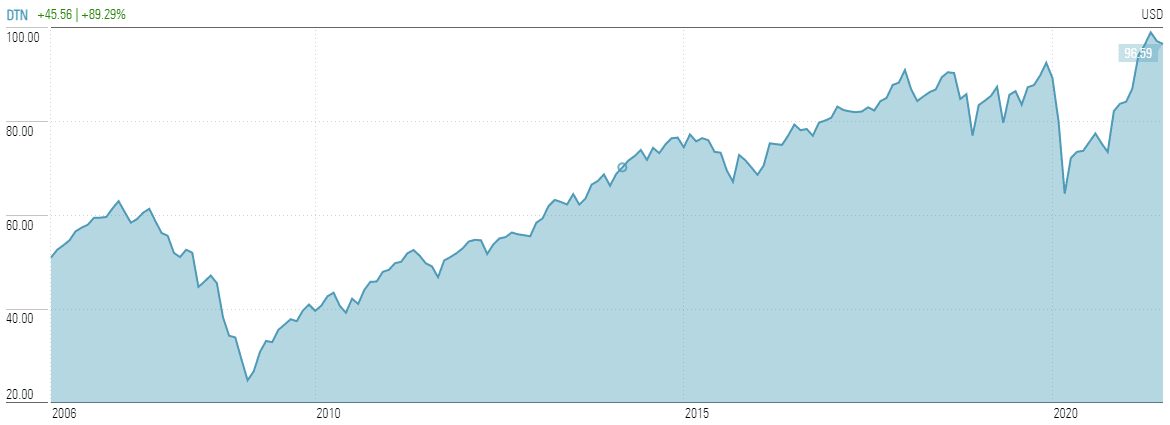 Der iShares Select Dividend ETF strebt die Nachbildung des Dow Jones US Select Dividend Index an. Die Besonderheit bei diesem Dividenden-ETF ist, dass 45 % der Unternehmen im Portfolio Mid-Caps und 9 % Small-Caps sind, was für diese Art von ETF ungewöhnlich ist.