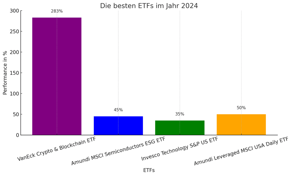 Im Jahr 2024 stachen insbesondere ETFs hervor, die auf Kryptowährungen und Blockchain-Technologie setzten. Der VanEck Crypto and Blockchain Innovators UCITS ETF erzielte etwa eine Rendite von über 283 %.