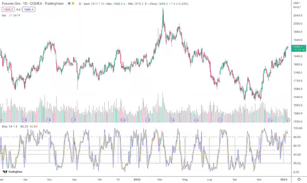 Der stochastische Oszillator ist in der technischen Analyse weit verbreitet. Er wurde 1970 von George Lane entwickelt. Der Indikator ist nützlich, um überkaufte und überverkaufte Zonen zu identifizieren, um dem Händler eventuelle Signale für den Ein- und Ausstieg aus einem bestimmten Rohstoff zu geben, wobei im Wesentlichen die Notierung in Bezug auf das Minimum und Maximum in einem bestimmten Zeitraum berücksichtigt wird. George Lane selbst benutzte es mit dem genauen Ziel, den Abstand zwischen den Balken/Kerzen, die sich dem Minimum oder Maximum eines Zeitintervalls nähern, zu bewerten. Es sind keine besonderen Berechnungen erforderlich, da die Handelsplattformen dies automatisch durchführen. Die Formel zur Berechnung des stochastischen Oszillators lautet wie folgt: