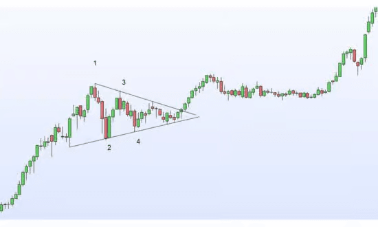 Im Falle eines Dreiecks mit bullischen Implikationen, dem ein Aufwärtstrend vorausgeht, muss Punkt 1 höher als Punkt 3 und Punkt 2 niedriger als Punkt 4 sein. Das Dreieck hat eine zeitliche Begrenzung für seine Bildung.