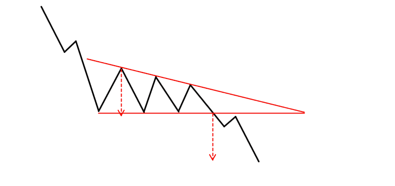 Dieses Muster ist im Wesentlichen das Gegenteil des aufsteigenden Dreiecks. Wenn der Kurs unter den unteren Rand der Unterstützungslinie des absteigenden Dreiecks fällt, signalisiert dies eine Fortsetzung des Abwärtstrends.