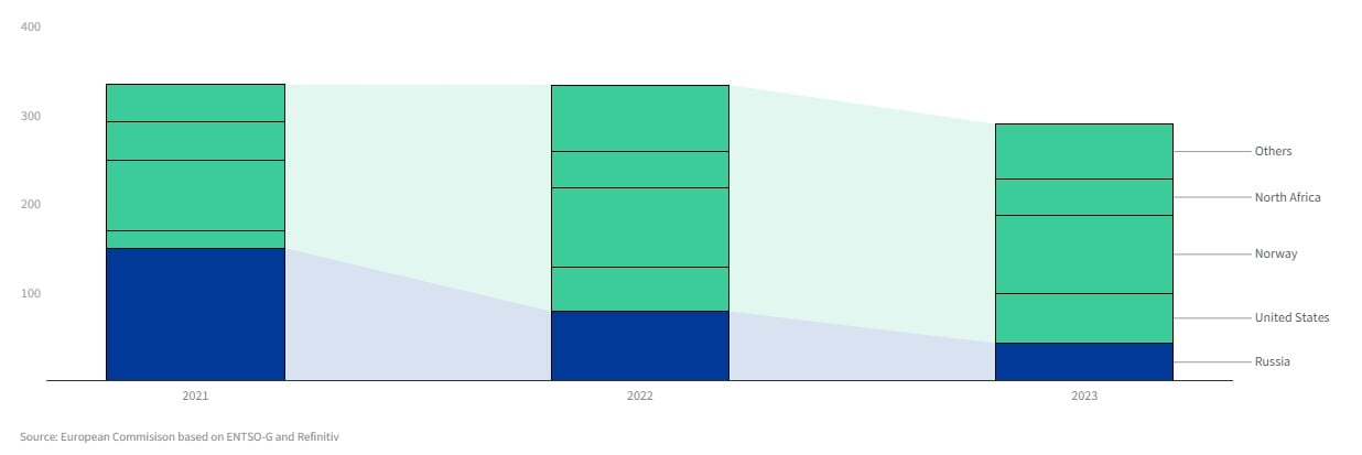 Nach der russischen Invasion hat die Europäische Union Maßnahmen ergriffen, um ihre Abhängigkeit von russischem Gas zu verringern. Während 2021 noch 40 % des importierten Gases aus Russland stammten, ist dieser Anteil 2023 auf unter 10 % gesunken.