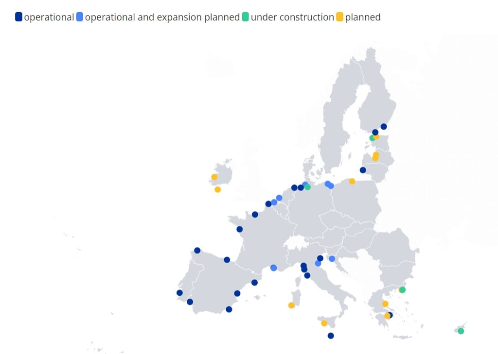 Wie in der obigen Abbildung zu sehen ist, stellen nur die dunkelblauen Punkte bestehende LNG-Terminals dar, von denen sich viele in Deutschland befinden. Das zeigt, dass Deutschland eine zentrale Rolle bei der LNG-Importstrategie der EU spielt. Die anderen Punkte kennzeichnen Projekte in Planung, im Ausbau oder im Bau.