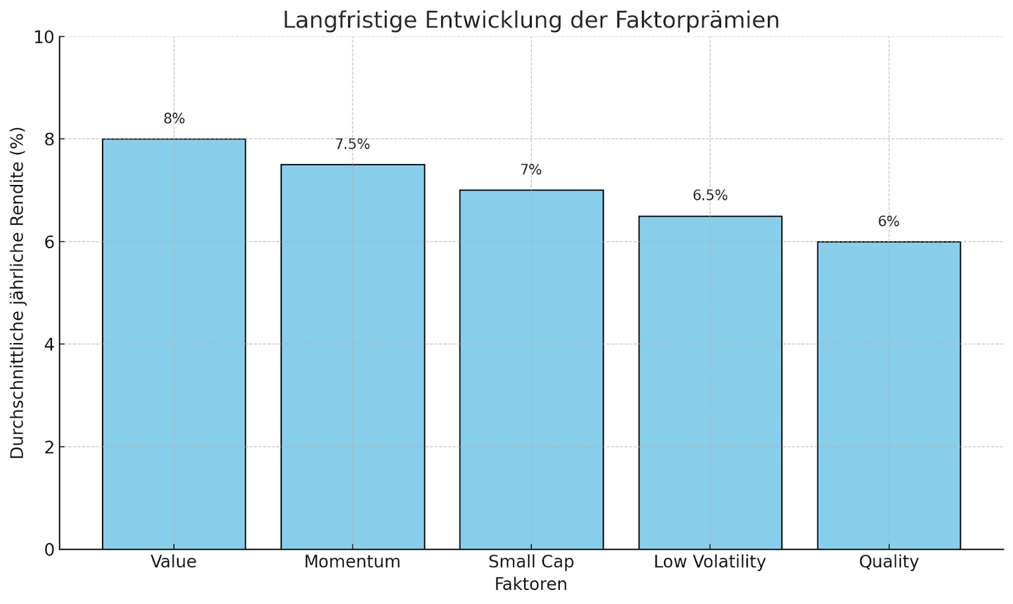 Hier ist ein Chart, der die langfristige Entwicklung der Faktorprämien zeigt. Die Balkenhöhen repräsentieren beispielhafte durchschnittliche jährliche Renditen für die verschiedenen Faktoren wie Value, Momentum und Small Cap. Lassen Sie mich wissen, wenn Anpassungen oder weitere Visualisierungen gewünscht sind!
