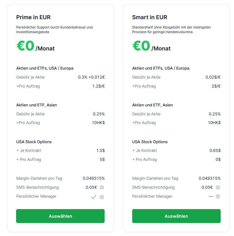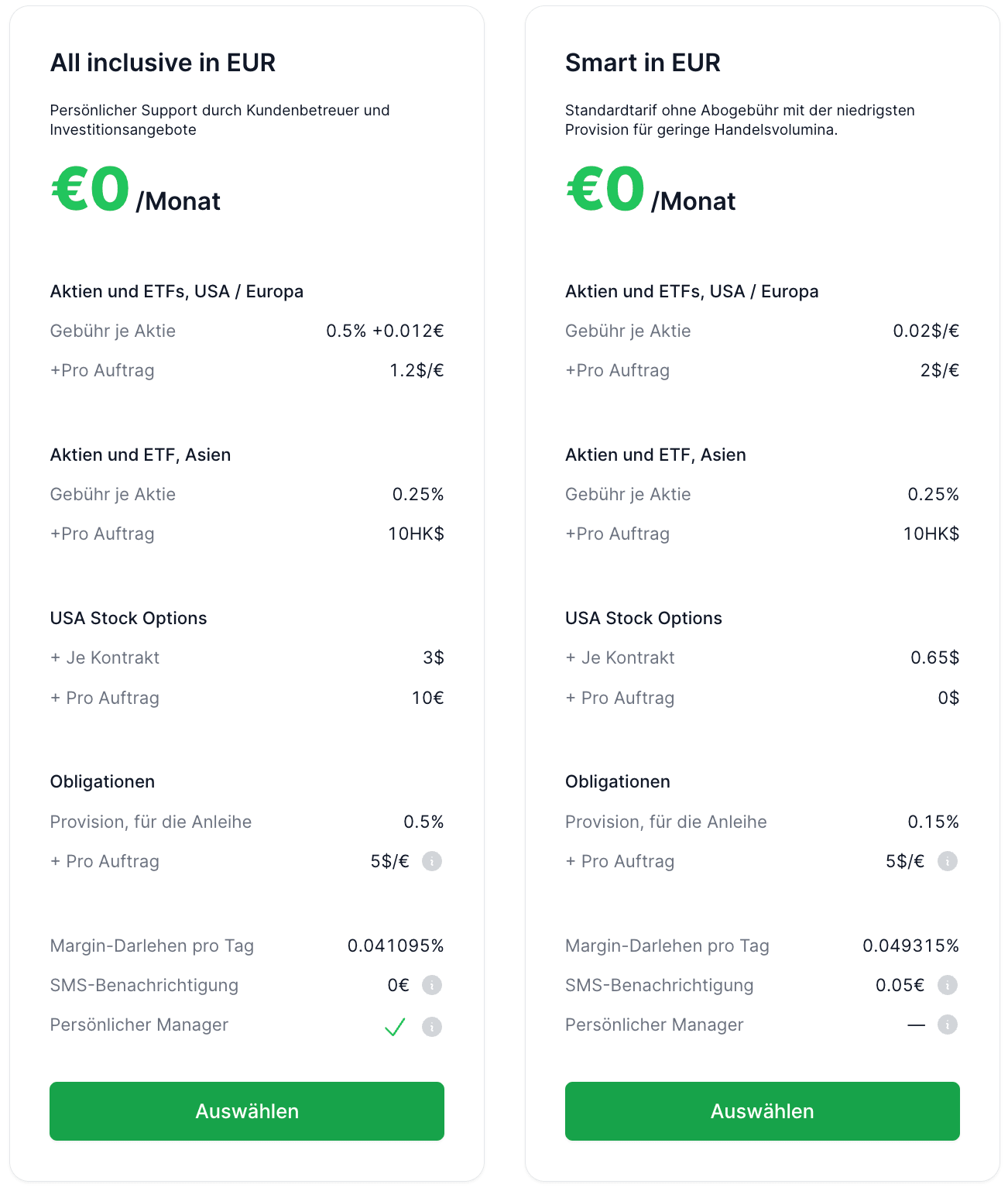| All-inclusive (USD) | US/EU | 0,5 % + 0,012 € je Aktie (min. 1,2 € je Auftrag) | — | USD-basiert |