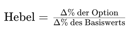 Der Hebel einer Option wird berechnet, indem die prozentuale Änderung des Optionspreises durch die prozentuale Änderung des Basiswertpreises geteilt wird: