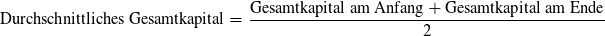 Um das durchschnittliche Gesamtkapital zu finden, nimmt man das Gesamtkapital am Anfang und am Ende einer bestimmten Zeit (meistens ein Jahr) und teilt es durch zwei. Die Formel sieht so aus: