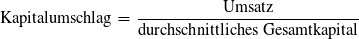 Um den Kapitalumschlag auszurechnen, nimmt man den Umsatz des Unternehmens und teilt ihn durch das Gesamtkapital. Das Ergebnis ist eine Zahl. Wenn die Zahl zum Beispiel 2 ist, dann hat das Unternehmen mit jedem Euro, den es hatte, zwei Euro Umsatz gemacht.