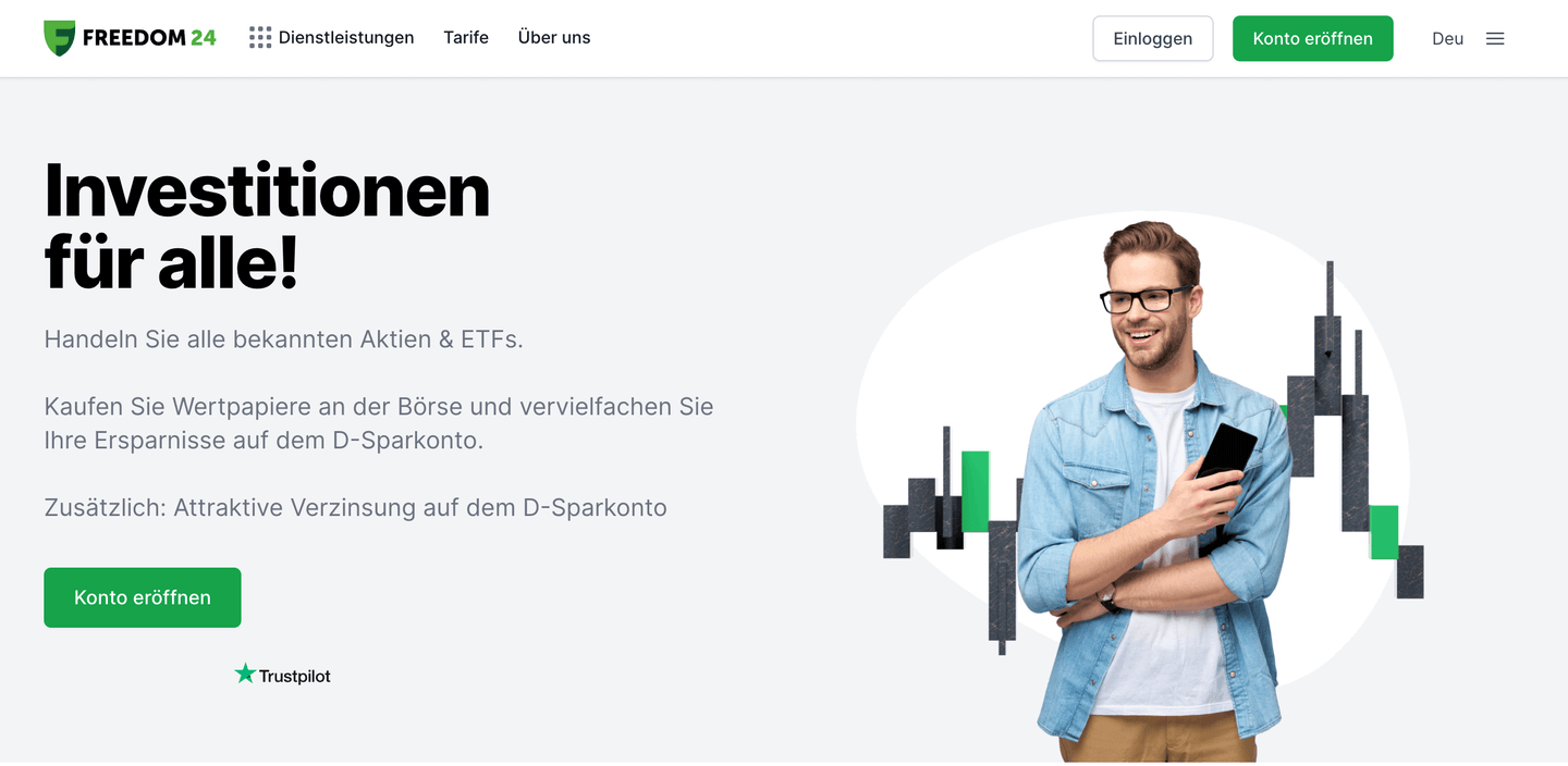 Es gibt viele Gründe, Freedom24 zu nutzen. Zum Einen bietet der Broker Zugang zu 40.000 Aktien und 3.600 ETFs an und bietet zudem eine innovative Trading App, die den Handel mit Aktien, ETFs und anderen Wertpapieren ermöglicht.