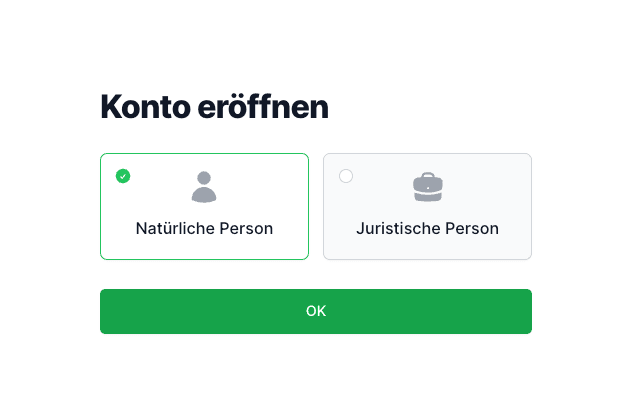 4. Wählen Sie den Kontotyp: Geben Sie an, ob Sie ein Konto als natürliche Person oder als juristische Person (Unternehmen) eröffnen. Als privater Anleger wählen Sie „natürliche Person“ und klicken auf „Weiter“.