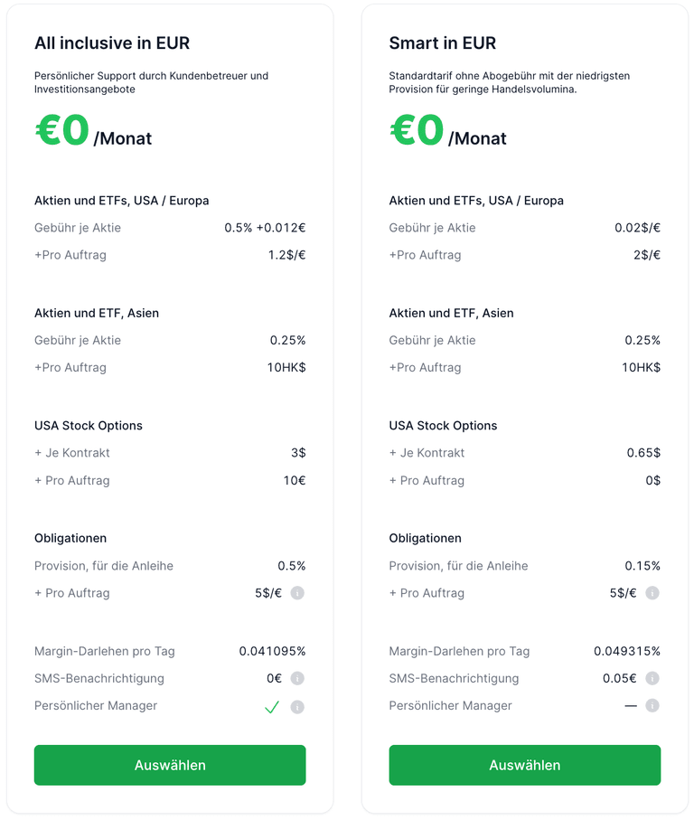Sobald Sie ein Konto eröffnet haben, können Sie zwischen den folgenden zwei Tarifen wählen: