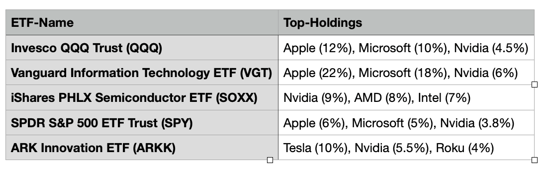 Nvidia ist in zahlreichen ETFs vertreten, die sich auf Technologie- und Halbleiterunternehmen konzentrieren. Zu den bekanntesten gehören der Invesco QQQ Trust (QQQ), der Vanguard Information Technology ETF (VGT) und der iShares PHLX Semiconductor ETF (SOXX). Diese ETFs bieten Anlegern die Möglichkeit, in ein diversifiziertes Portfolio zu investieren, das Nvidia sowie andere führende Technologieunternehmen umfasst.