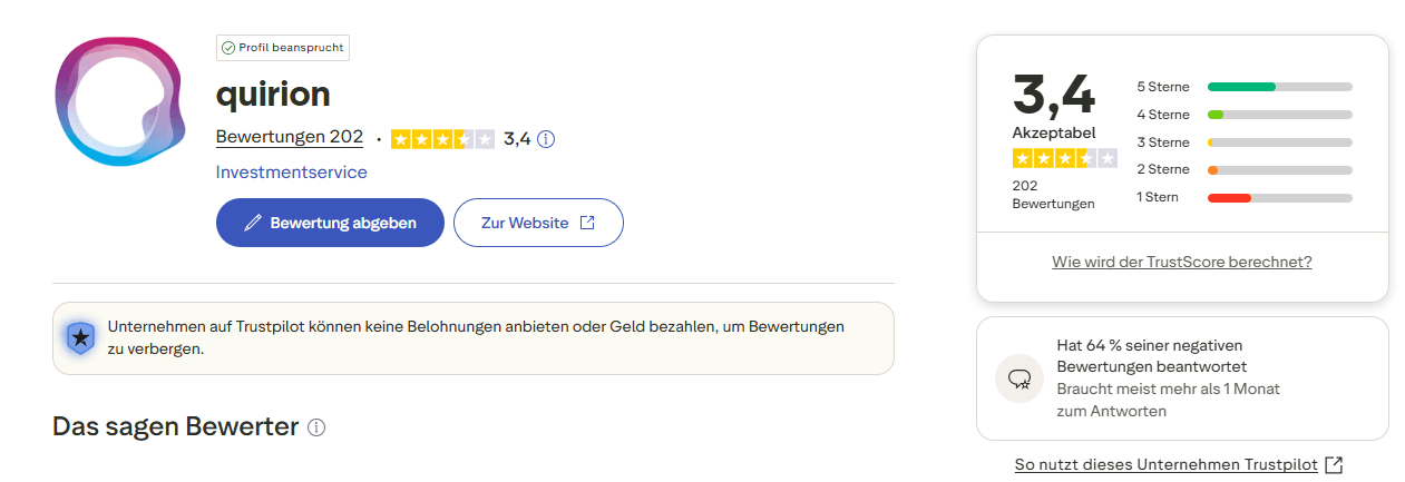 Die Wahrnehmung von Quirion ist zweigeteilt: Während Fachmagazine und Testinstanzen den Robo-Advisor regelmäßig zum Testsieger krönen, zeigen Nutzerbewertungen auf Portalen wie Trustpilot ein differenzierteres, teils kritisches Bild,,. Mit einer aktuellen Bewertung von 3,4 bis 3,5 von 5 Sternen wird der Service auf Trustpilot als „Akzeptabel“ eingestuft.