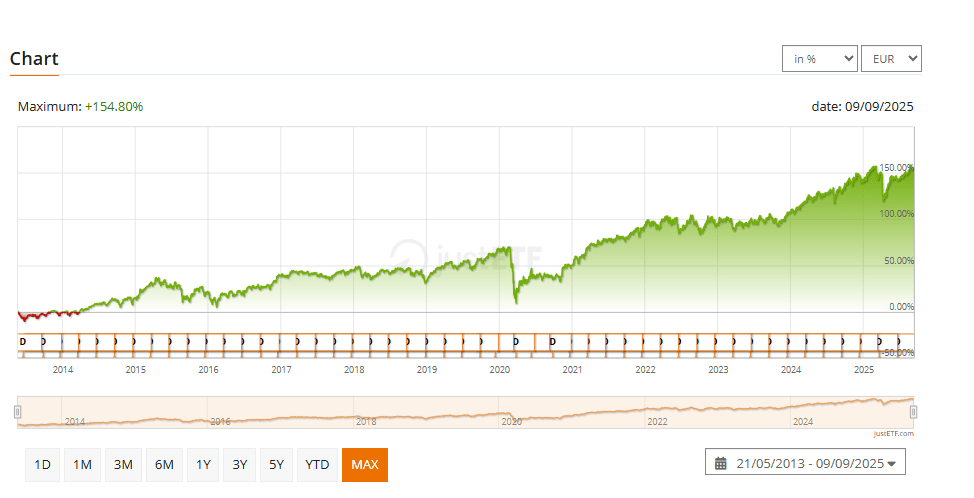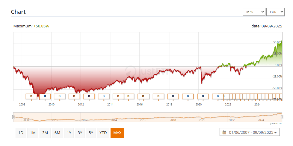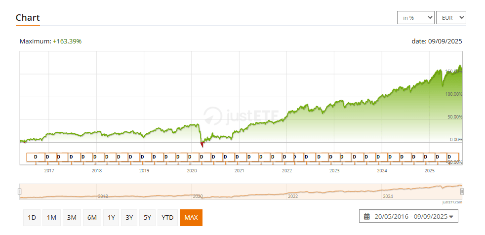 Was die Rendite betrifft, so hat der ETF eine sehr gute Leistung gezeigt, mit einer akkumulierten Rendite von über 100 % in den letzten 5 Jahren und nahe 40 % in den letzten 3 Jahren, mit kaum nennenswerten Rückgängen, außer während der Trump-Zollkrise. In jedem Fall geringer als bei einem „reinen“ MSCI World ETF.