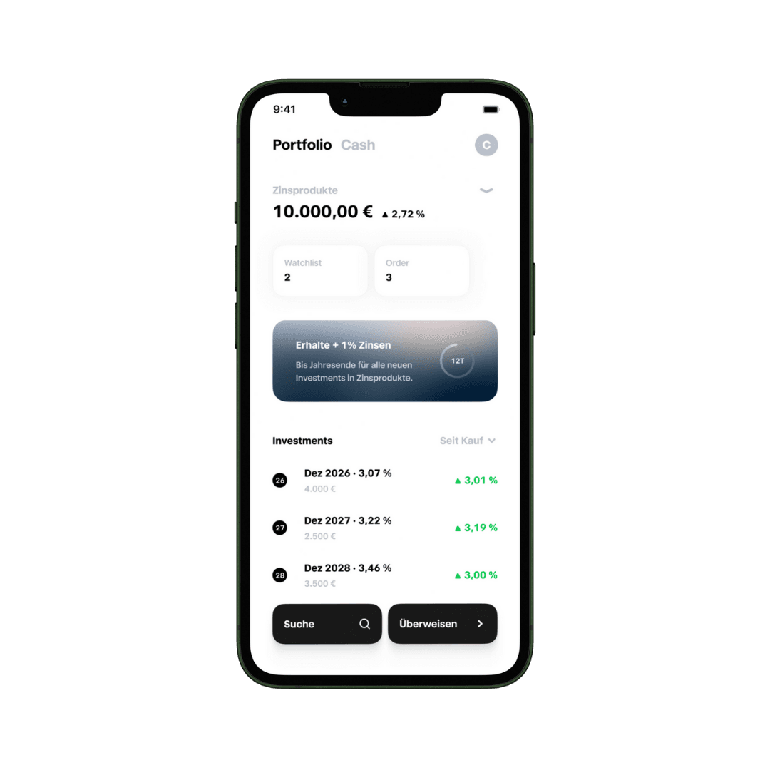 Zum Start gibt’s on top einen +1 % Zins-Bonus auf jede Investition in Zinsprodukte innerhalb der ersten 30 Tage (15.10.–13.11.). Der Bonus läuft bis Ende 2025, sofern du bis zur Fälligkeit hältst.