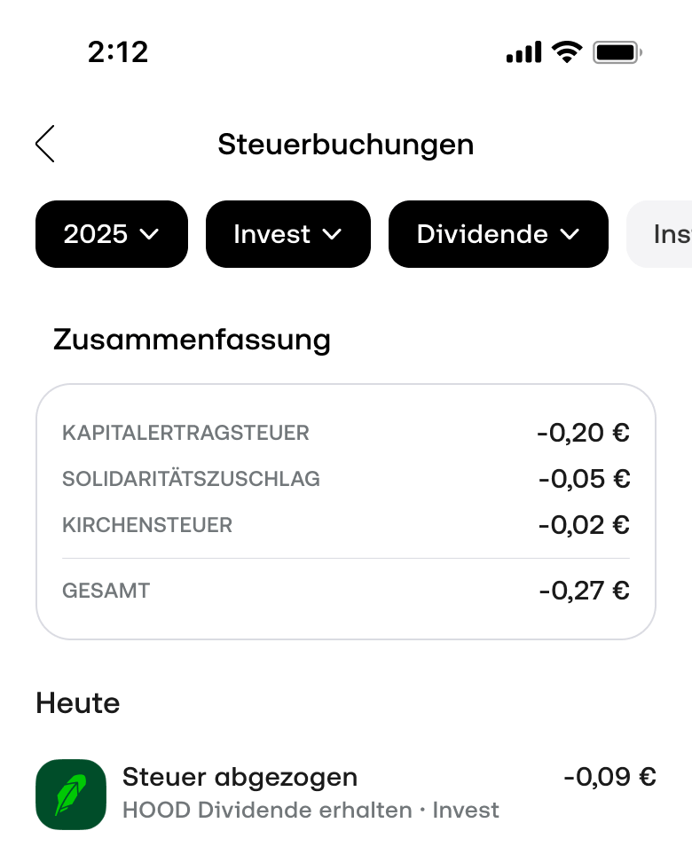 Trading 212 nennt für Deutschland konkret diese Abzüge: Kapitalertragsteuer (25%), Solidaritätszuschlag (5,5% auf die Kapitalertragsteuer) und ggf. Kirchensteuer (0/8/9% – je nach Bundesland/Kirchenstatus).