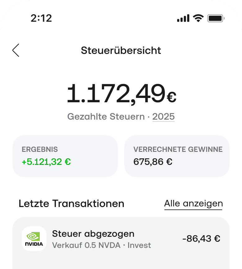 Zweitens: In die Steuerübersicht gehen (Einstellungen → Tax overview / Steuerübersicht). Dort siehst du gezahlte Steuern, Verlusttöpfe und den Freistellungsauftrag.