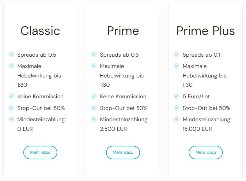 Im Classic-Konto, das kostenlos ist, beträgt die Kosten des Spreads 0,7. Die Spread-Gebühr sinkt auf 0,5 im Prime-Konto, das eine Mindesteinlage von 2.500 Euro erfordert. Für das Prime Plus-Konto beträgt der Spread bereits 0,1, es ist jedoch eine Mindesteinlage von 15.000 Euro erforderlich. Darüber hinaus gibt es eine Gebühr von 5 Euro pro Lot.