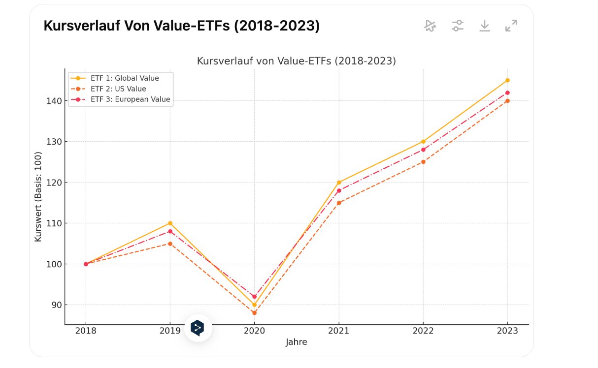 Die Kursentwicklung von Value-ETFs zeigt, dass sie sich in unsicheren Märkten häufig besser behaupten als Growth-ETFs. Während der Pandemie 2020 haben Value-Aktien zunächst an Boden verloren, aber ab 2021 ein starkes Comeback hingelegt. Beispielsweise verzeichnete der iShares MSCI World Value ETF eine durchschnittliche jährliche Rendite von 7,5 % in den letzten fünf Jahren.