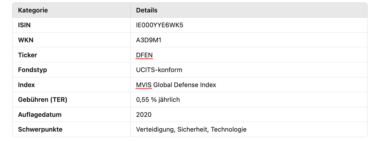 Der VanEck Defense ETF ist ein UCITS-konformer Fonds, der Unternehmen aus der internationalen Verteidigungsindustrie abbildet. Sein Ziel ist es, die Wertentwicklung des MVIS Global Defense Index so genau wie möglich zu reflektieren. Mit einer transparenten Gebührenstruktur und einer breiten Diversifikation spricht der ETF sowohl sicherheitsorientierte Anleger als auch Renditejäger an.