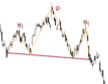 Auf einem Chart erkennt man eine Schulter-Kopf-Schulter-Formation, wenn man eine ähnliche Entwicklung wie in der unten stehenden Grafik sieht. Mit anderen Worten, wenn der Chart eine ähnliche Figur wie die gezeigte zeichnet. Wie in den Indikationen zu sehen ist, sind die Schulter, der Kopf und die andere Schulter zu sehen, wodurch diese wichtige charttechnische Figur gezeichnet wird.