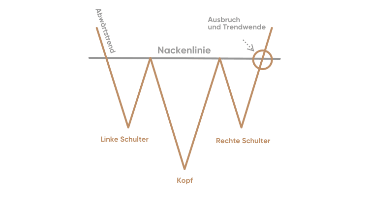So wie es die Schulter-Kopf-Schulter-Formation gibt, gibt es auch die umgekehrte Schulter-Kopf-Schulter-Formation oder auch bullische Schulter-Kopf-Schulter-Formation genannt.