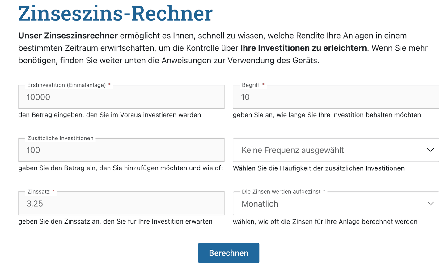 Wie du siehst, ist die Berechnung des Zinseszinses einfach, kann aber mühsam werden, wenn du es über viele Jahre oder für tägliche, monatliche Zinsen usw. berechnen möchtest. Daher gibt es viele Zinseszinsrechner im Internet, die du nutzen kannst.