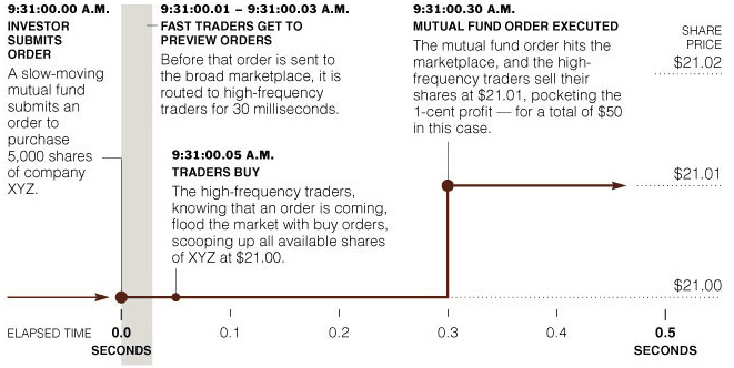 “Seine Analyse deckt sich mit den Überlegungen in Michael Lewis' Buch "Flash Boys: A Wall Street Revolt", wonach Hochfrequenzhändler die Geschwindigkeit ihrer Systeme ausnutzen, die ihnen einen Vorsprung von Millisekunden verschaffen, um kleinere Anleger bei der Auftragsausführung zu überholen.”